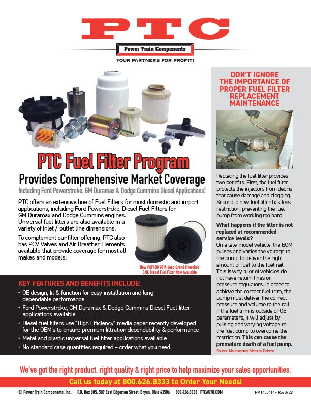 PTC’s Fuel Filter Program delivers OE-quality protection for both gas and diesel vehicles. With extensive coverage—including Ford Powerstroke, GM Duramax, and Dodge Cummins applications—plus a full range of universal filter options, PTC helps protect today’s fuel systems while minimizing installation headaches.
