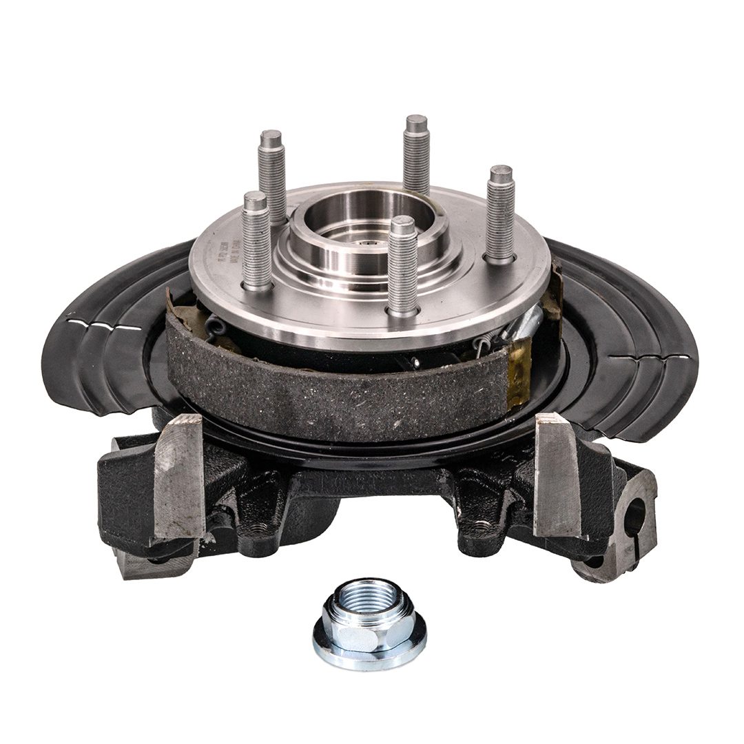 A complete steering knuckle assembly includes the knuckle, pressed-in hub, bearing, and often a backing plate and hardware—preassembled for easy installation.